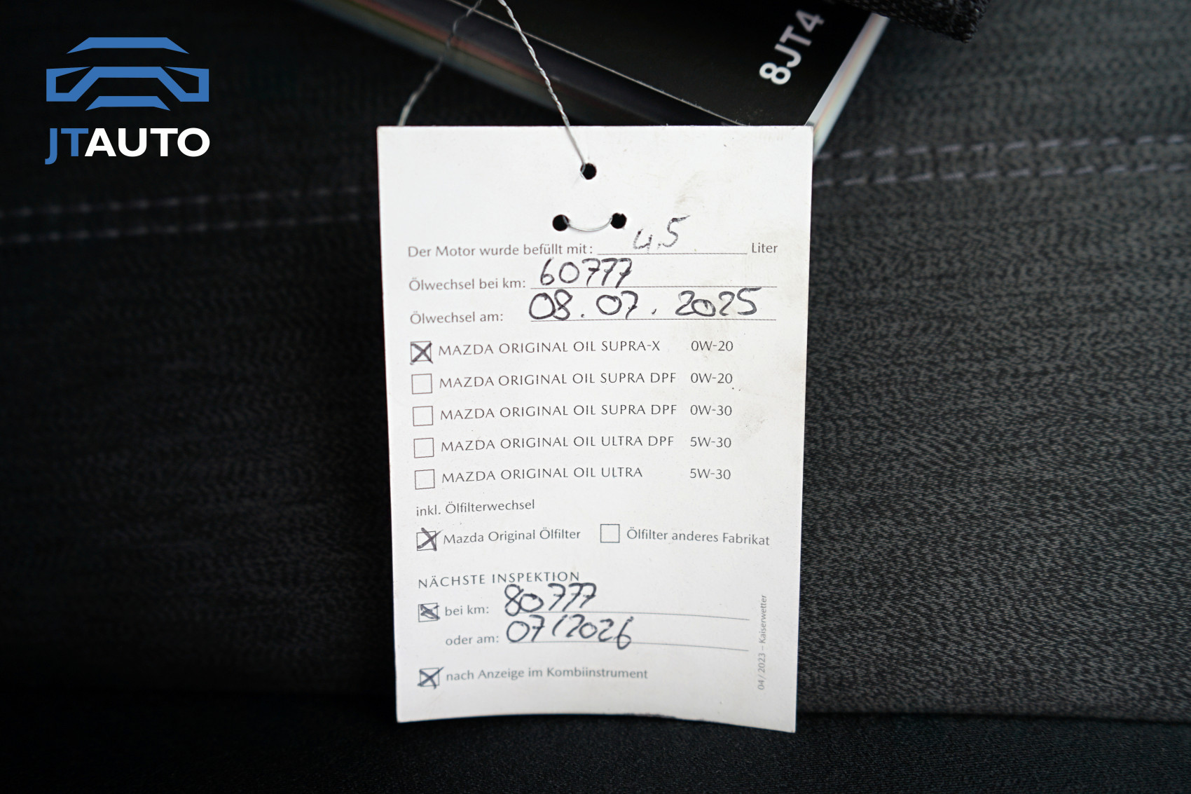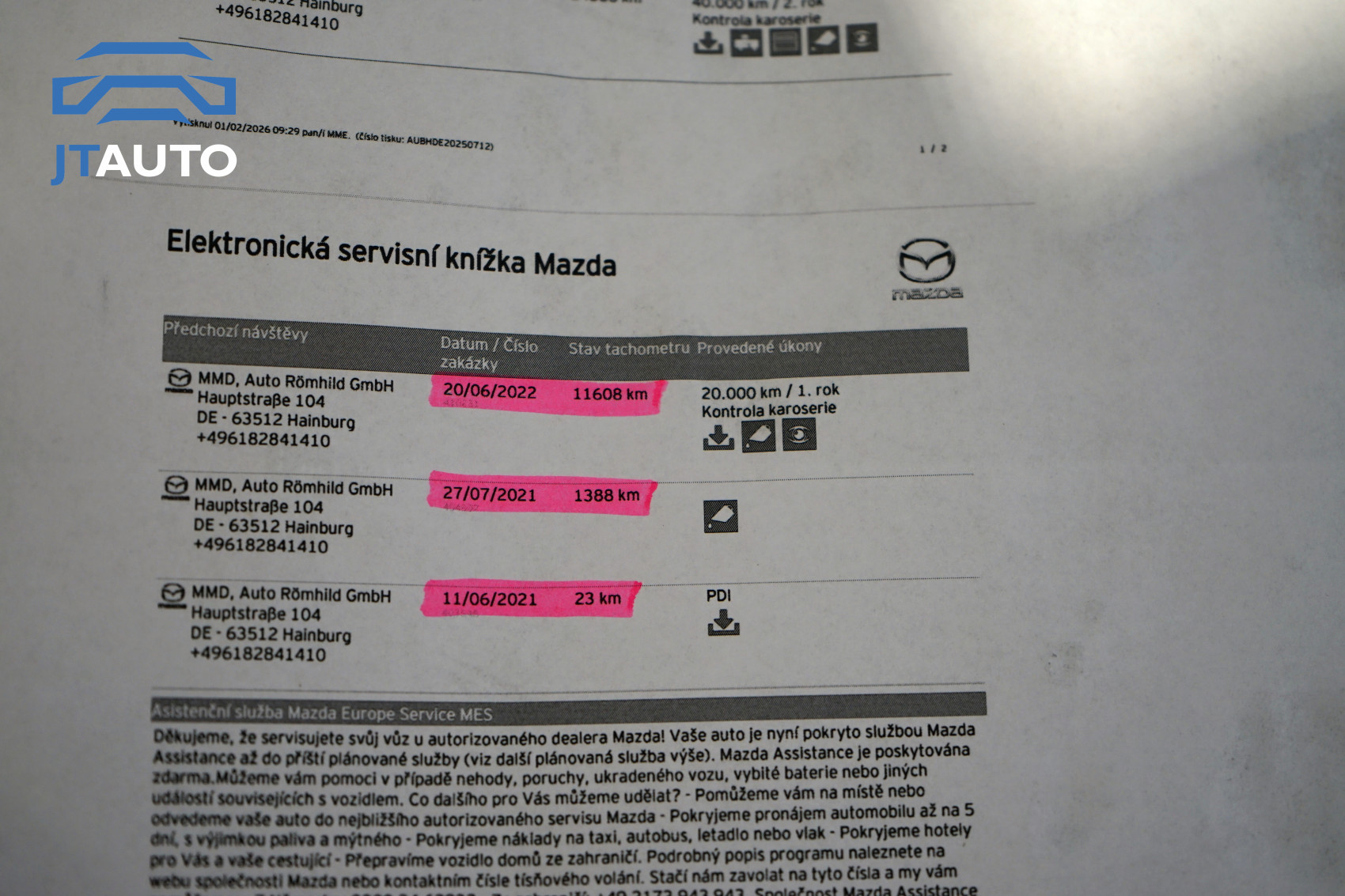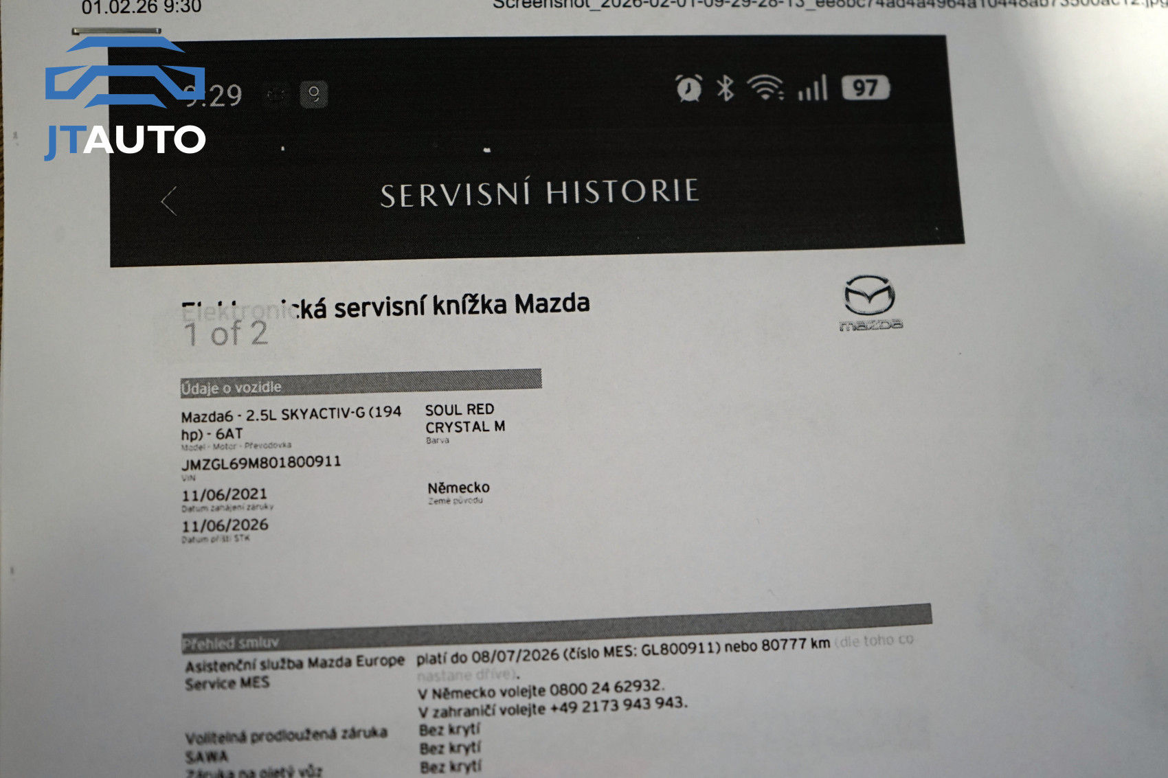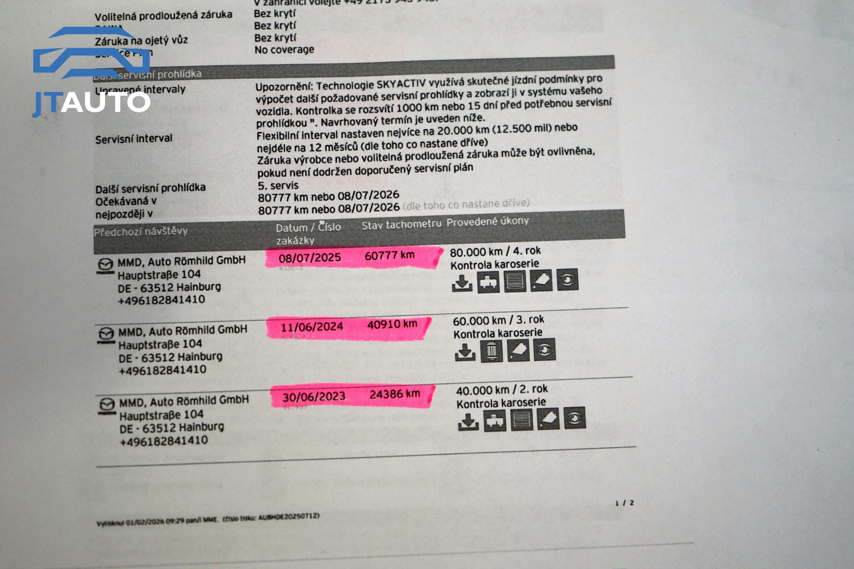 Pravidelně servisováno pouze v autorizovaném servisu Mazda. Poslední servisní prohlídka v 60777 km 08.07.2025